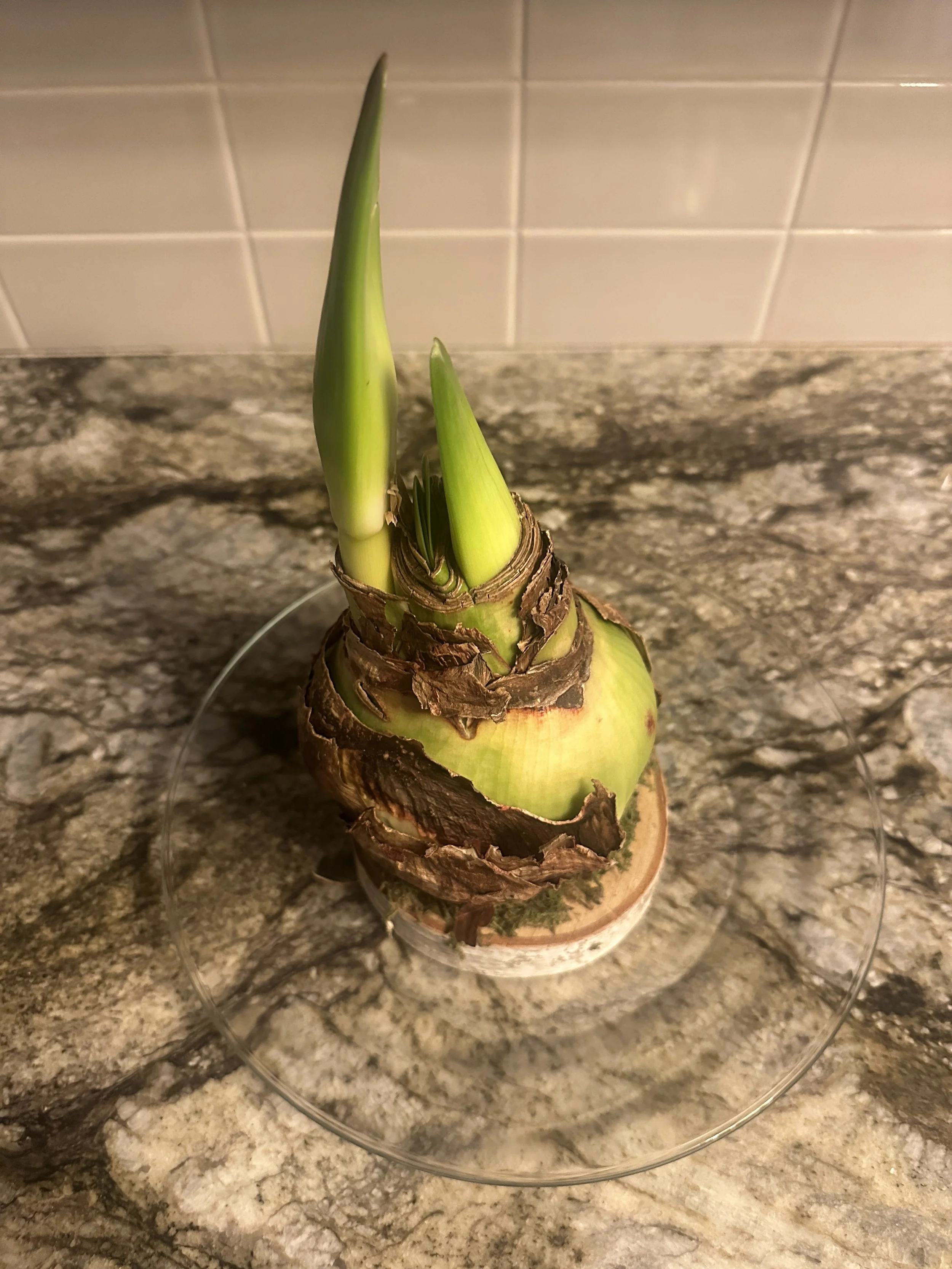 I received the most fascinating gift this holiday season. An amaryllis bulb perched on a piece of birch wood. No dirt beneath it. No water around it. Just this beautiful bulb with tender green shoots already reaching upward from its crown.