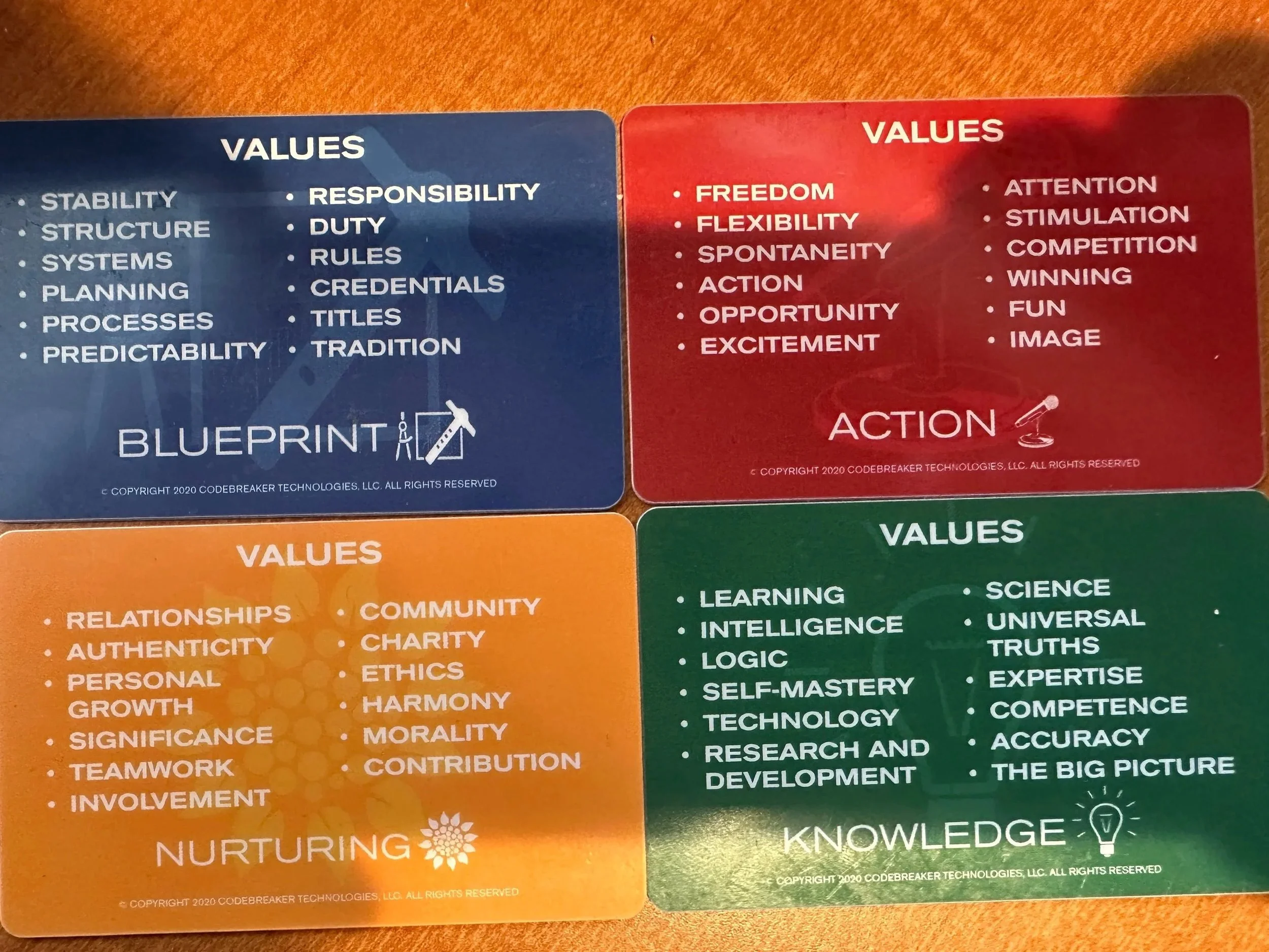We worked through the B.A.N.K. model and tied it back to compassion, intention, and impact. Amy scored as NBKA (Nurturing, Blueprint, Knowledge, Action). Awareness that her job is the BK part and what she brings to work. The N is a huge part of her but is subdued (for now 😉). We also guessed at a couple other relationships and how they work together.